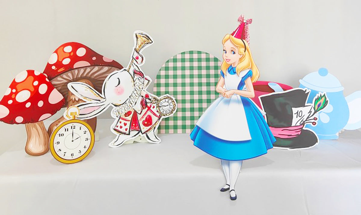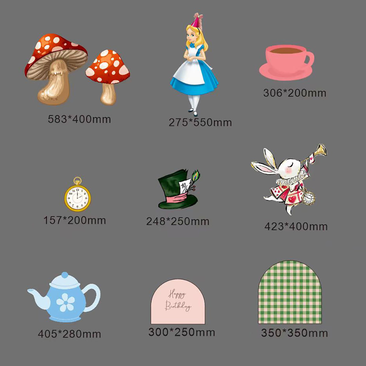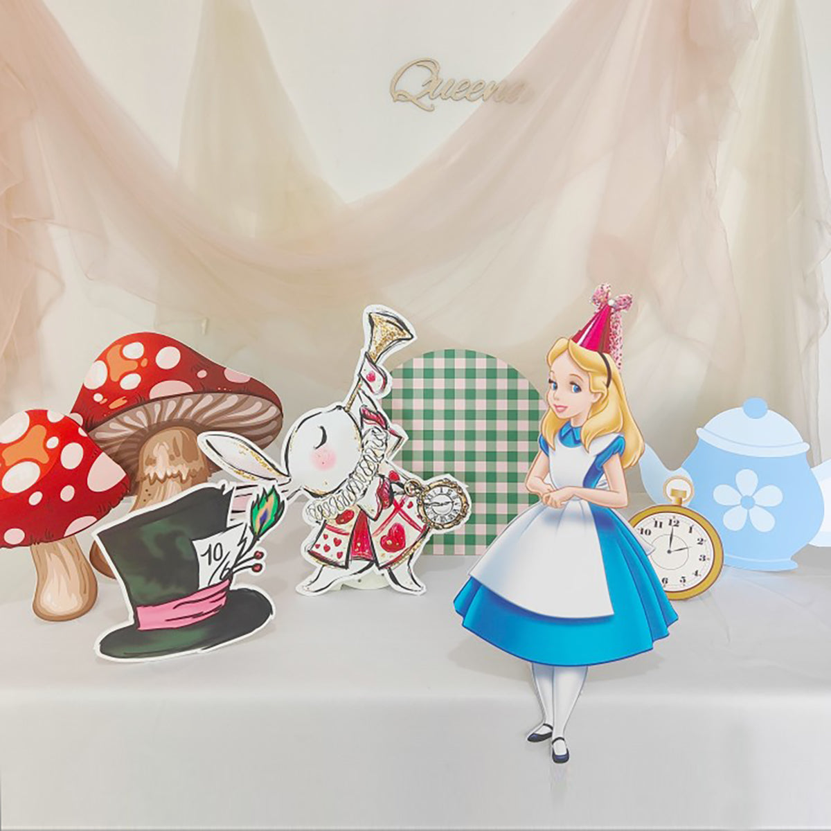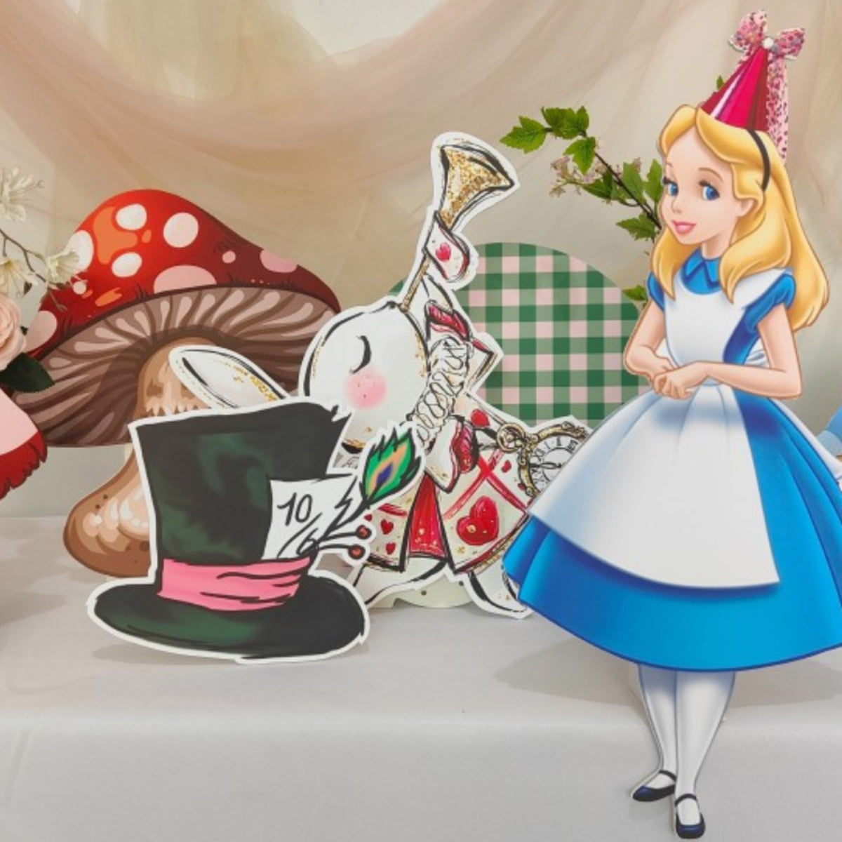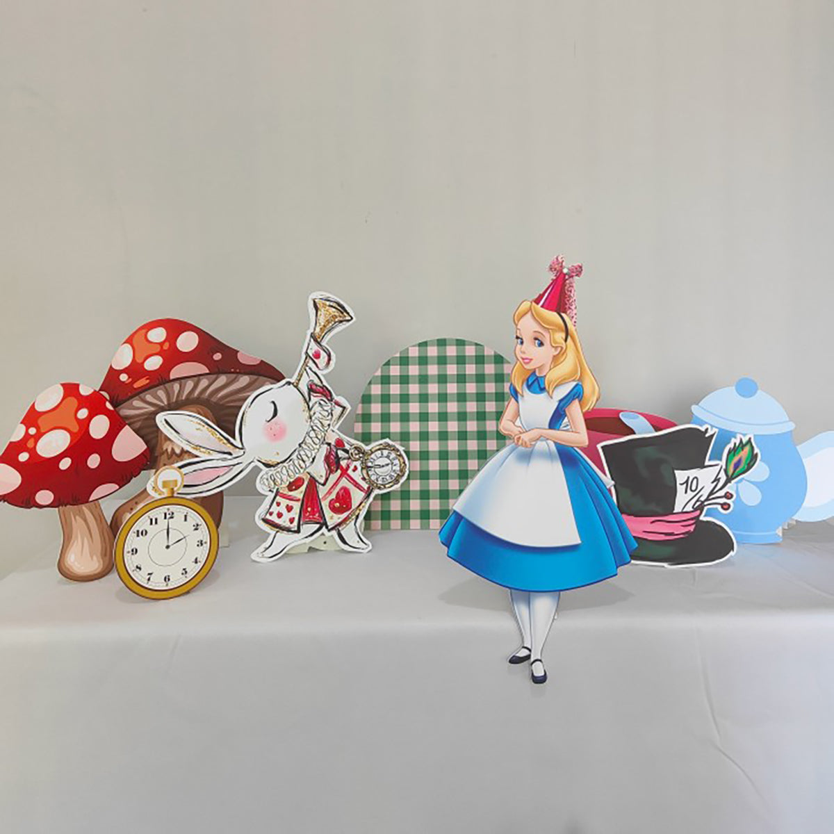 - The set includes 9 hand-painted foam board cutouts of Alice and friends in Wonderland, featuring high-definition prints. Red magical mushrooms, Alice, the Mad Hatter, the trumpet-blowing rabbit, a whimsical teapot, a clock, and tea. Join a Wonderland adventure and let these cartoon cutouts decorate your party.