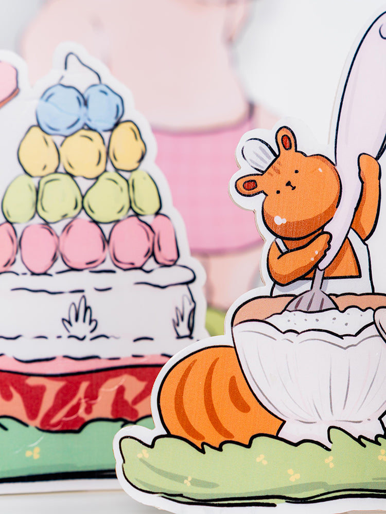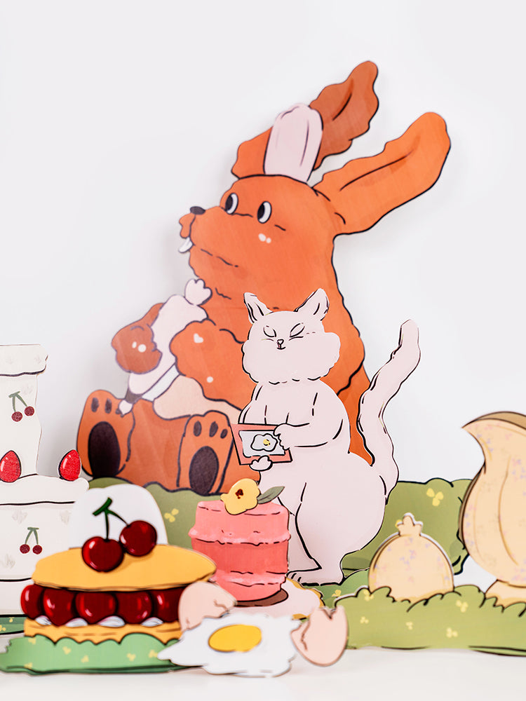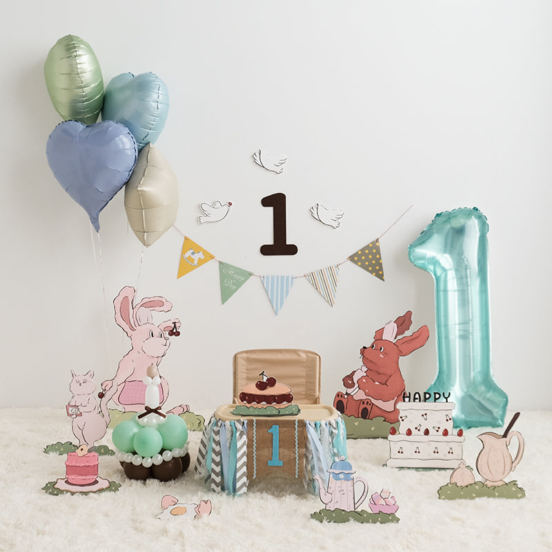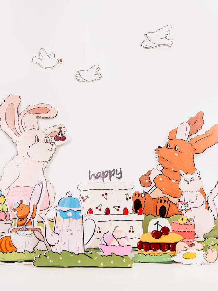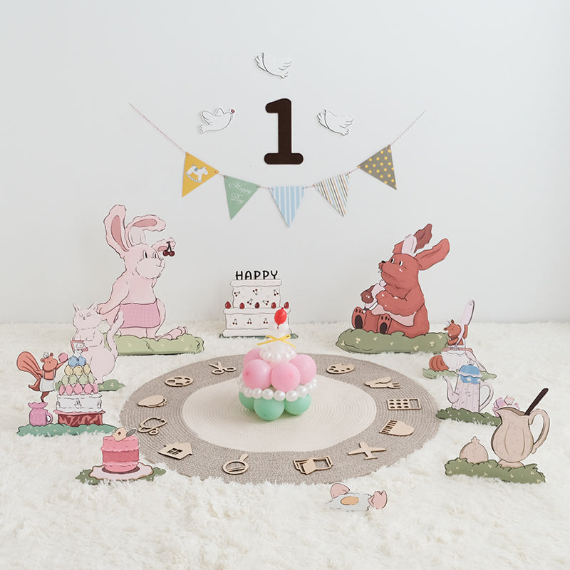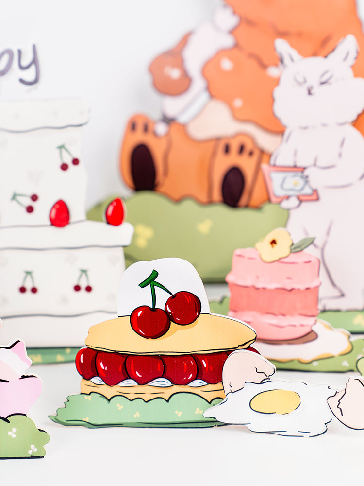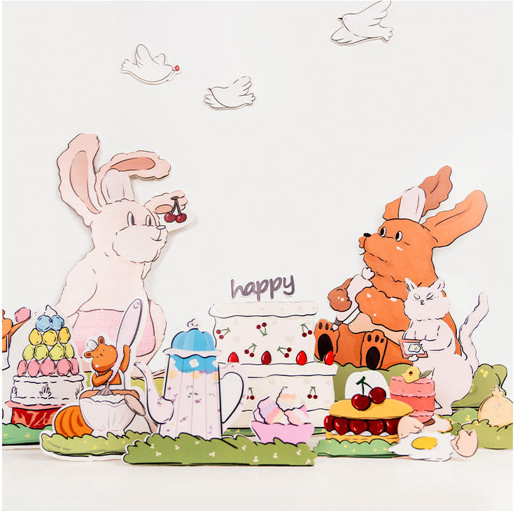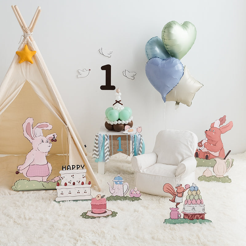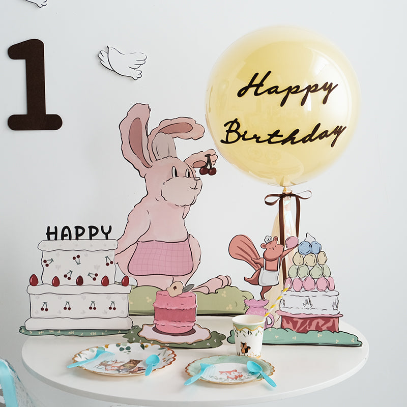- Transform any space into a whimsical children's fairy tale party with our set of 14 high-definition printed foam boards. Featuring elements from a cartoon animal tea party—including flying birds, birthday cake, cherry desserts, macarons, a tea-serving white cat, garden teapot, honey pot, and green lawn flowers—the set is perfect for desktop, floor, and garden lawn placements, as well as wall decorations. Measuring approximately 4ft/1.2M tall and 5ft/1.5M wide, it's designed to create a magical atmosphere for children's joyful celebrations.
