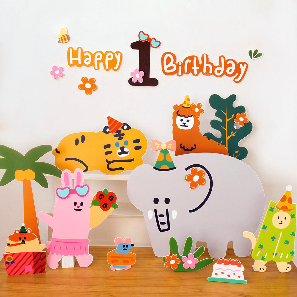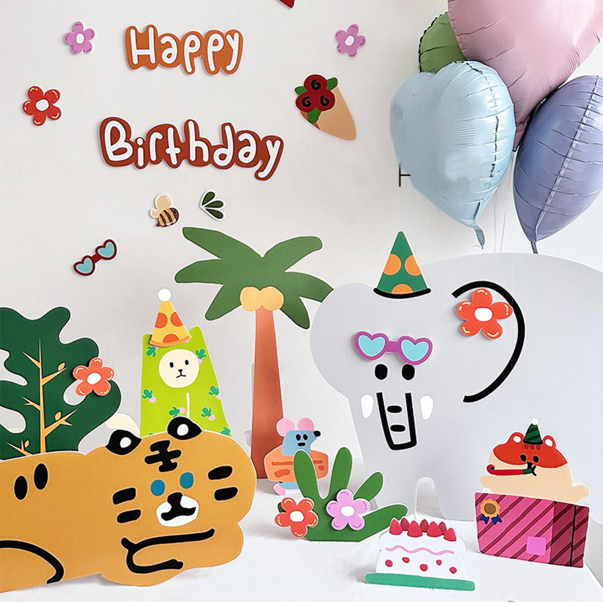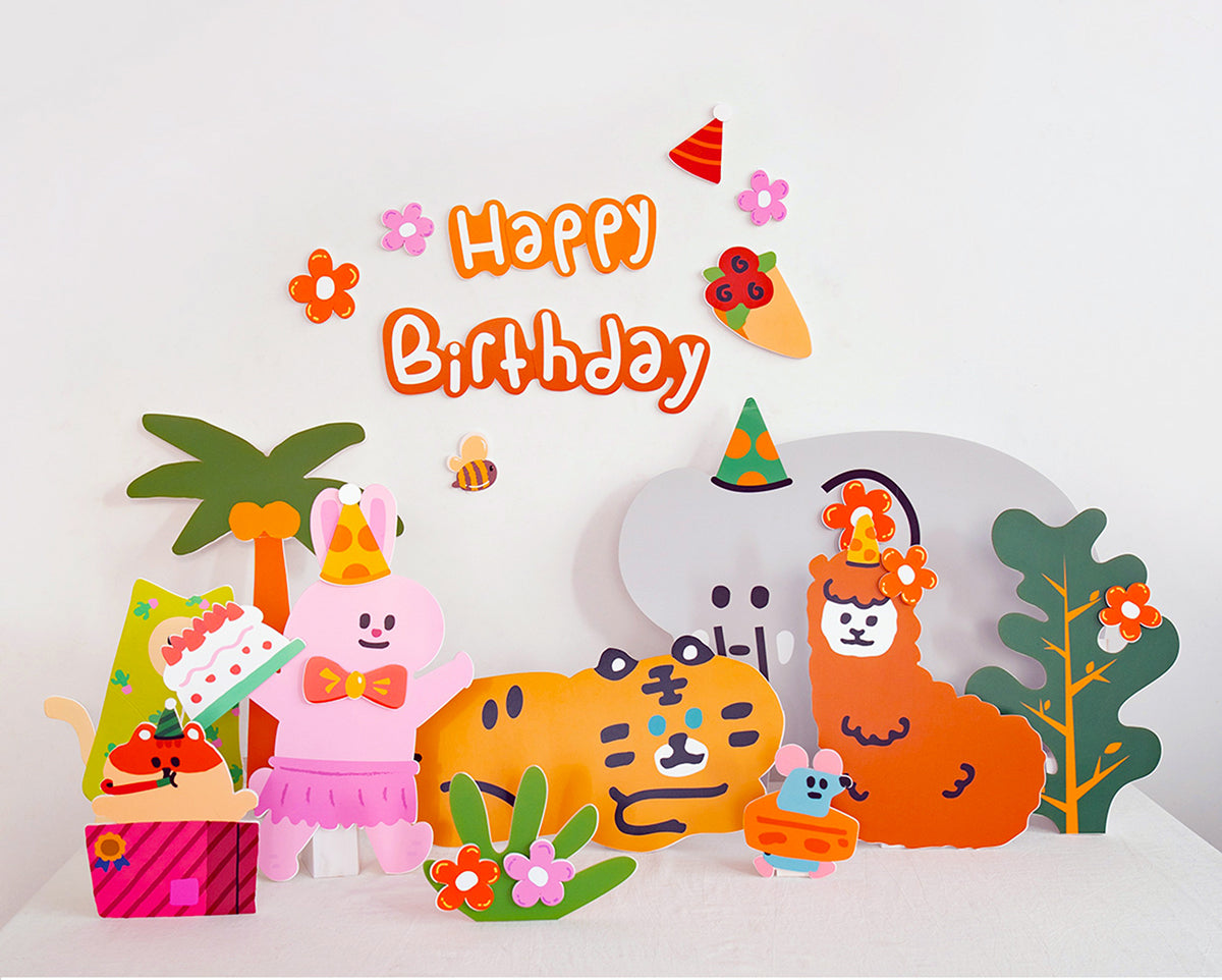 - Set of 29 Printed Foam Board Cutouts: Hand-painted cartoon animals enjoying a summer party under palm trees. Includes rabbits, elephants, tigers, alpacas, mice, and bees holding cakes, dancing, and adorned with flowers. Perfect for a festive 'Happy Birthday' celebration.