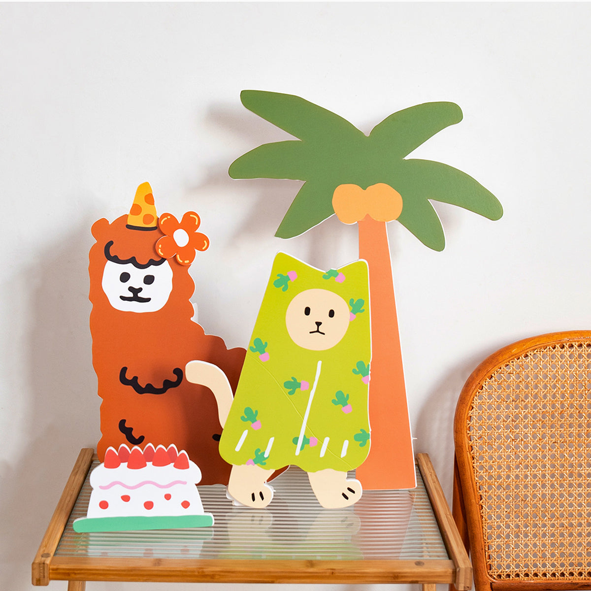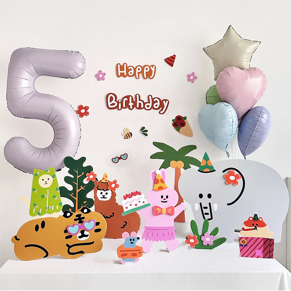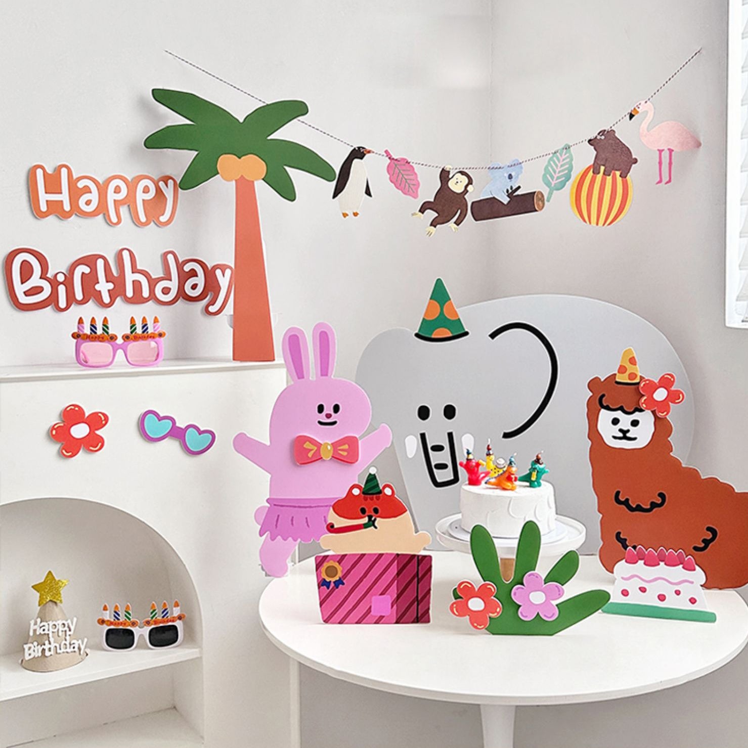 - Set of 29 Printed Foam Board Cutouts: Hand-painted cartoon animals enjoying a summer party under palm trees. Includes rabbits, elephants, tigers, alpacas, mice, and bees holding cakes, dancing, and adorned with flowers. Perfect for a festive 'Happy Birthday' celebration.