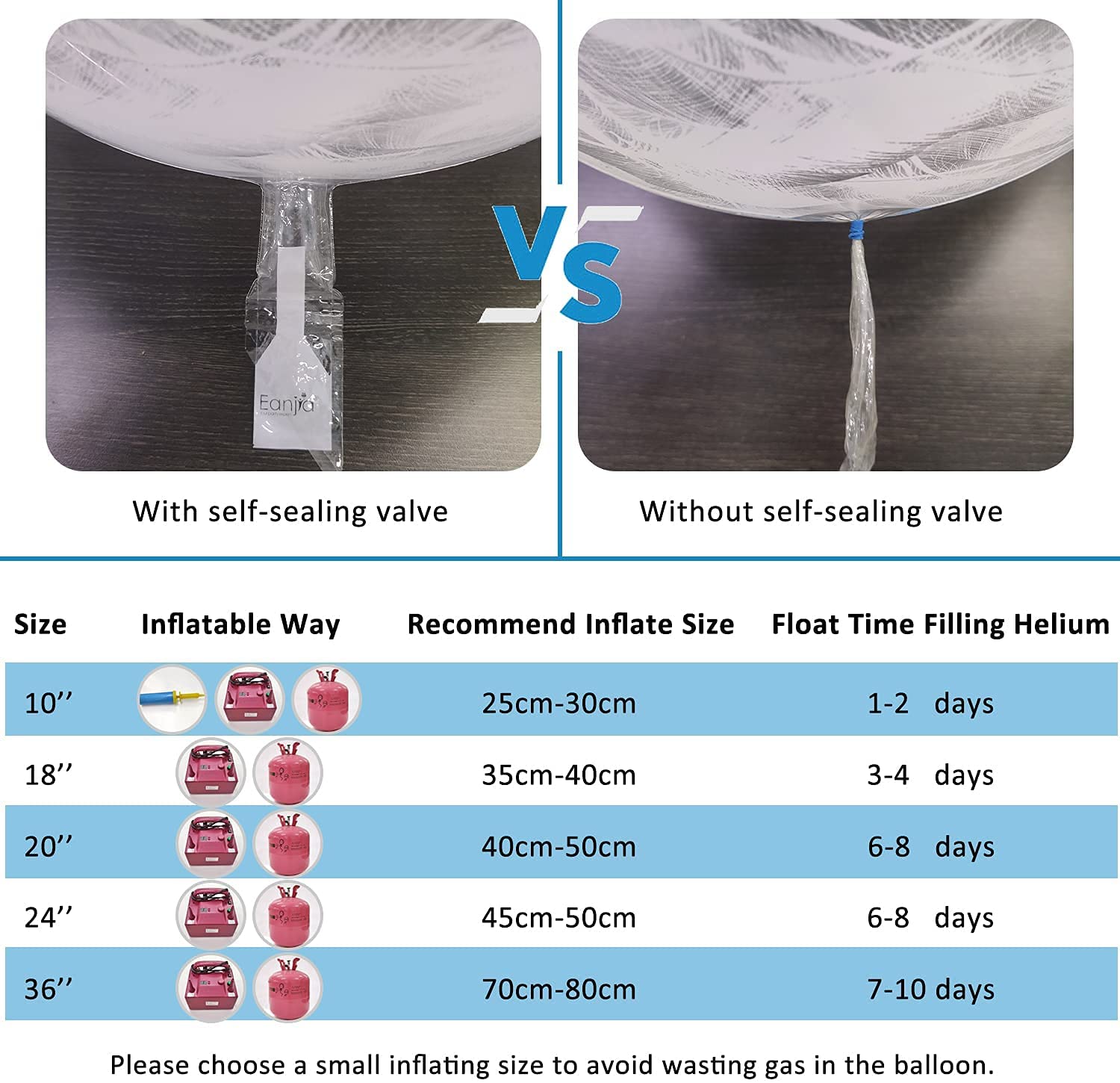 - Self-sealing Valve. Eanjia’s bubble balloon has a self-sealing valve. After filling with air or helium, the self-sealing valve will automatically bond. It is easier to store helium. The floating time of helium is 3-4 days. The built-in straw allows you to easily deflate and store the bubble balloon for reuse.