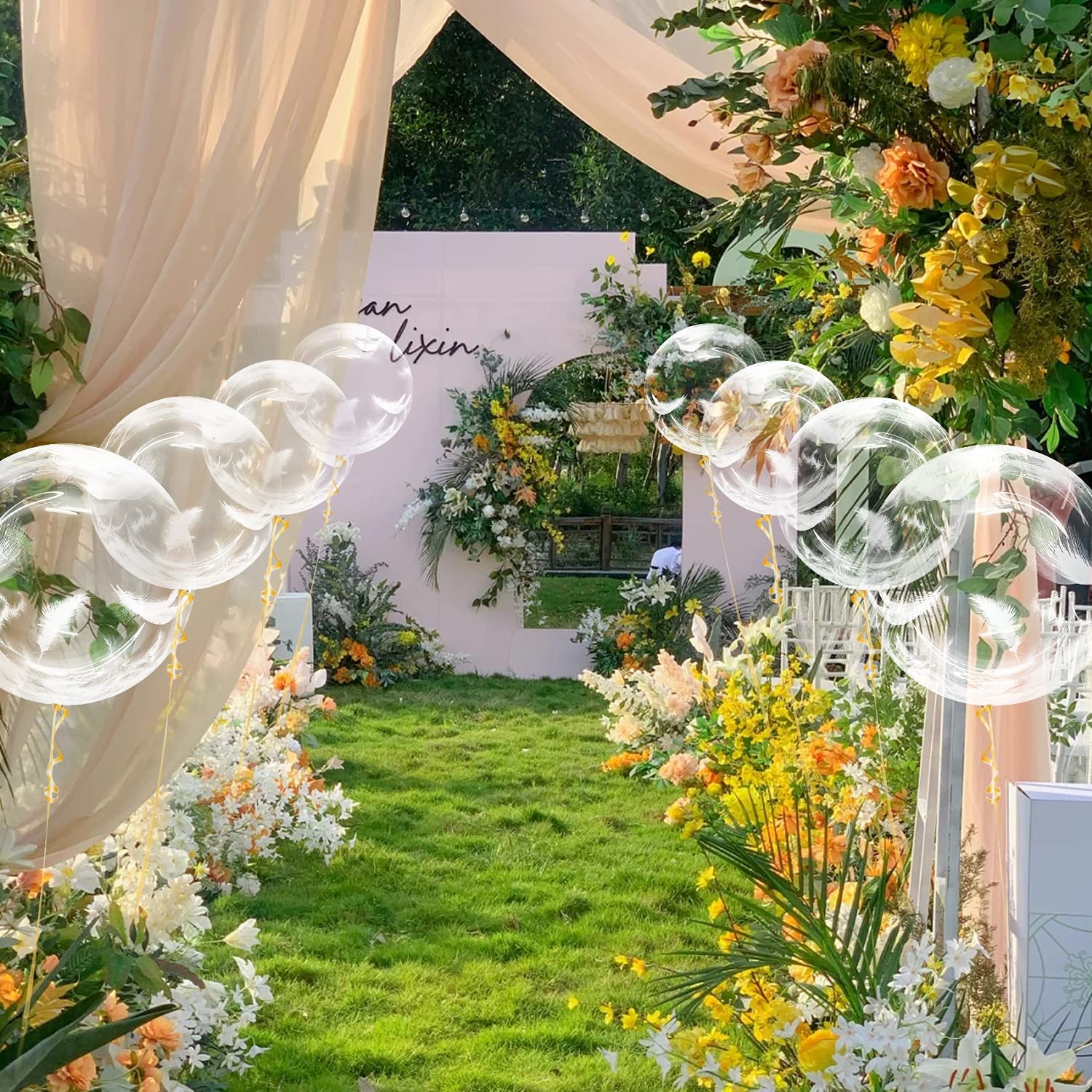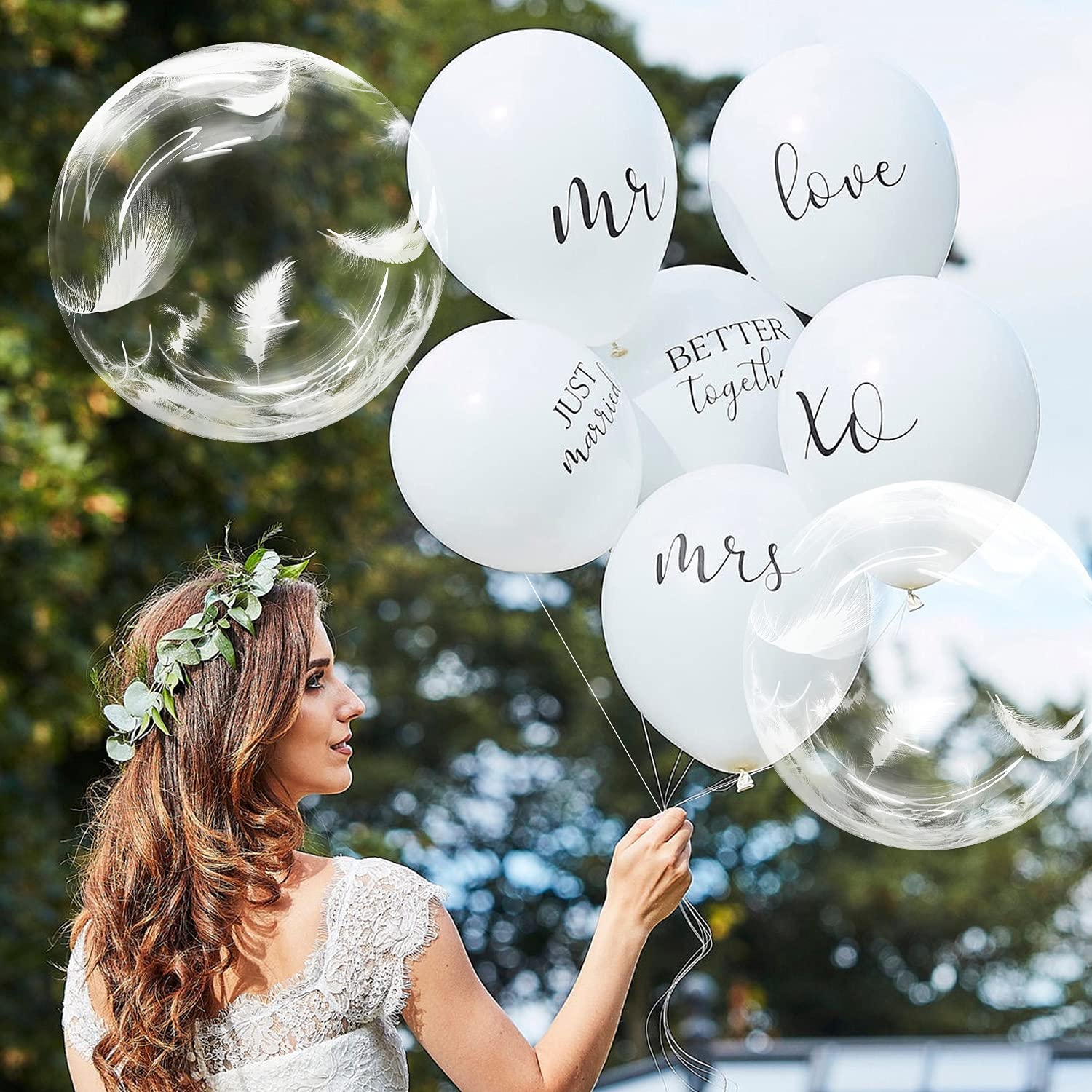 - √ Wedding Decorations Balloons. 18inch White Feather Printed Bubble Balloons 10pcs.Bubble Balloons will make your Wedding event party unforgettable.Very suitable for baby showers, 22nd birthday decorations, bridal showers, bachelor party supplies, wedding anniversary decor, or make a beautiful photo zone.