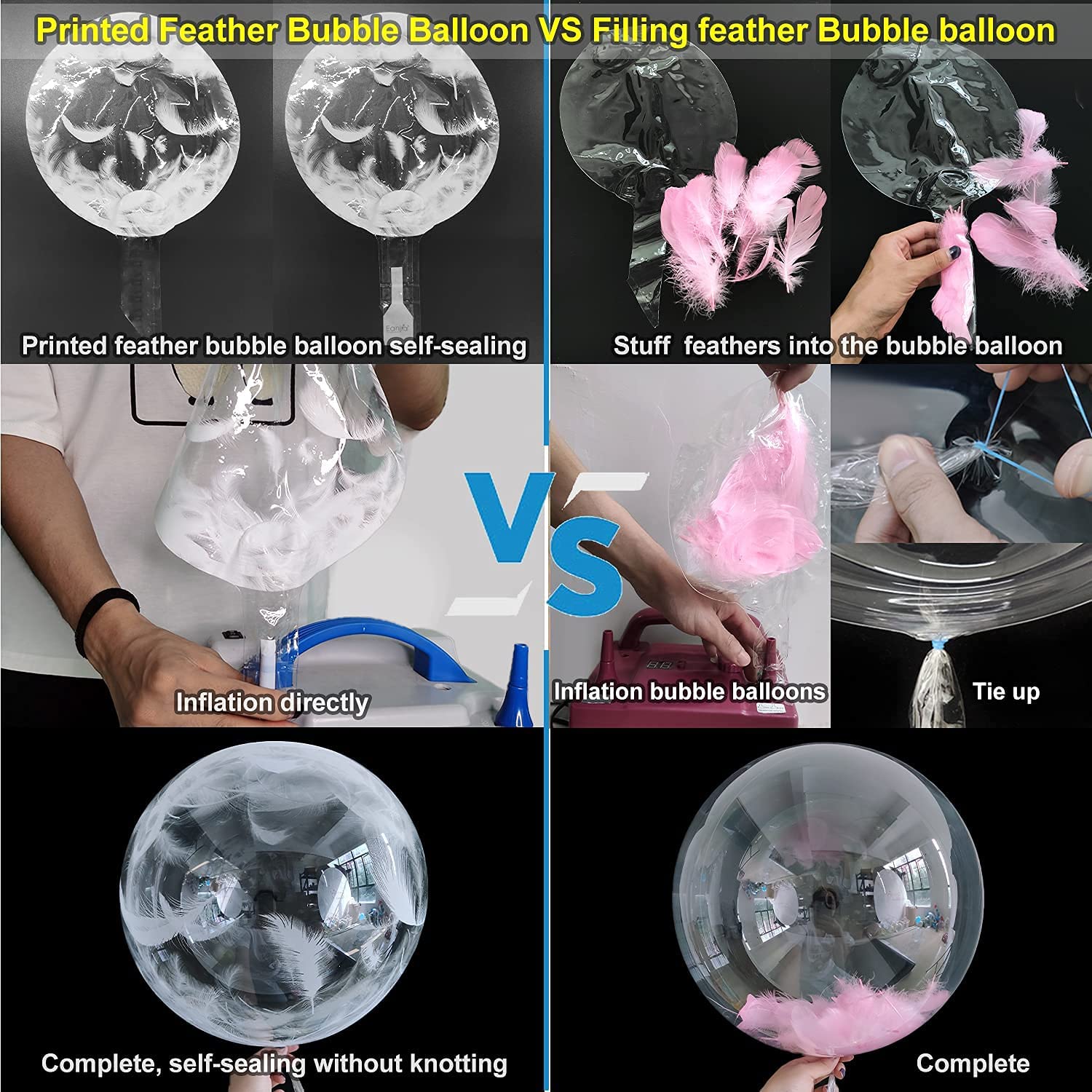 - √Save You DIY Time. Feather-filled bubble balloons must be filled into the balloon to inflate and then tied. Eanjia's feather bubble balloon is directly inflated and automatically sealed. It can show the effect of a feather sticking to the side. We can easily inflate them with a pump, which saves you time.