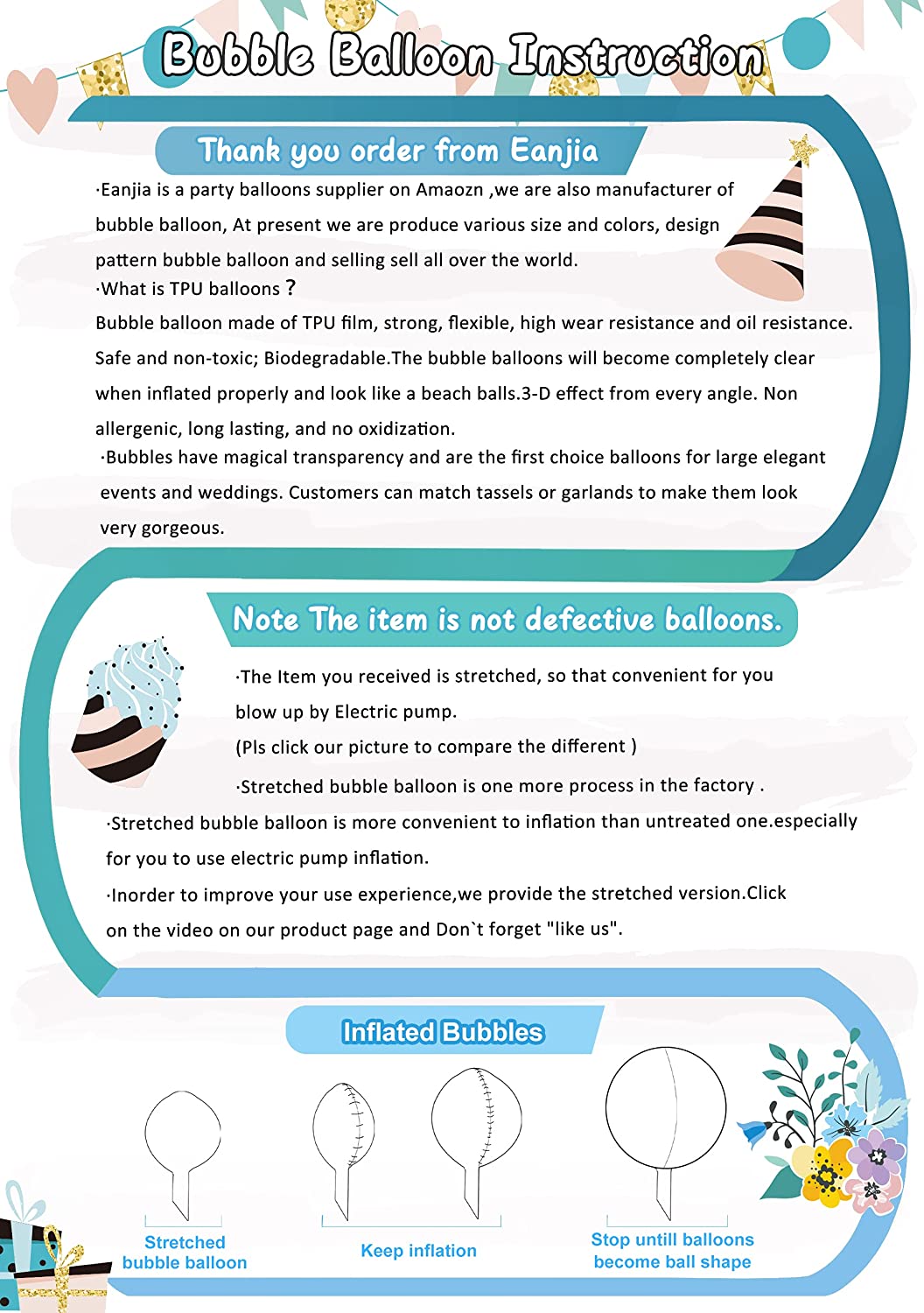 - √ CLEAR AND DURABLE. All Eanjia bubble balloons are made of TPU material. Therefore, compared to those latex balloons, they are completely transparent, antioxidant, and more durable. It is a strong, soft film and full of elasticity.