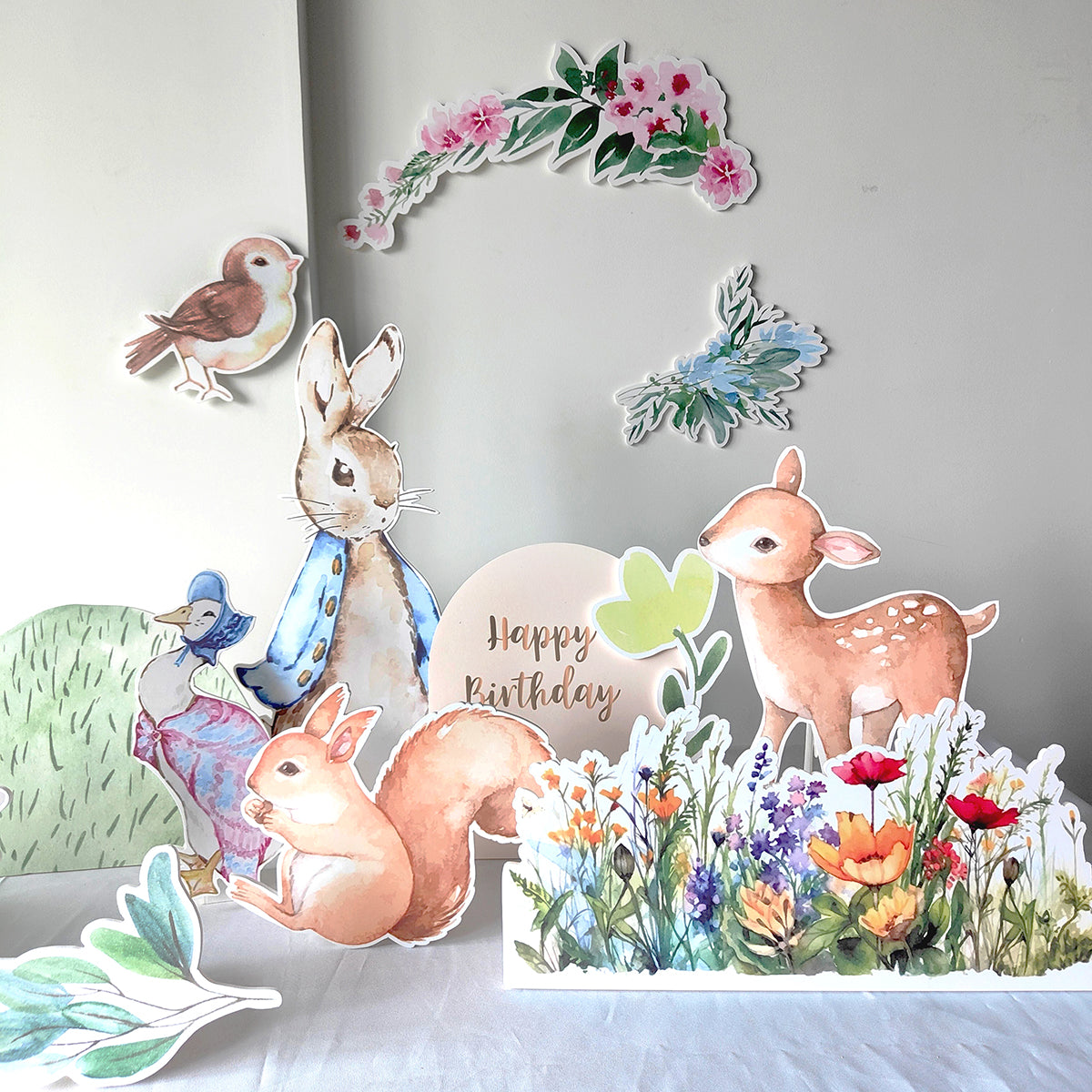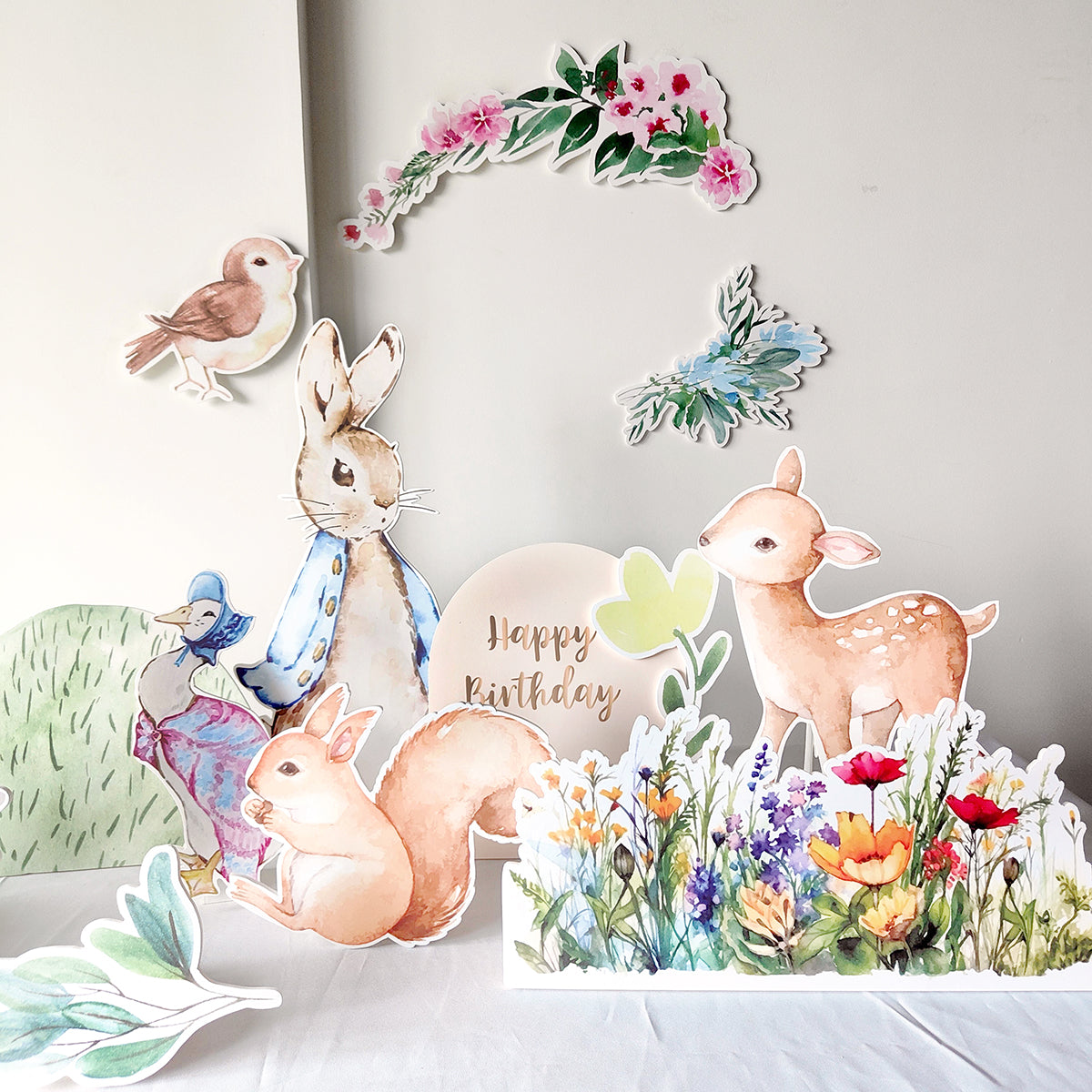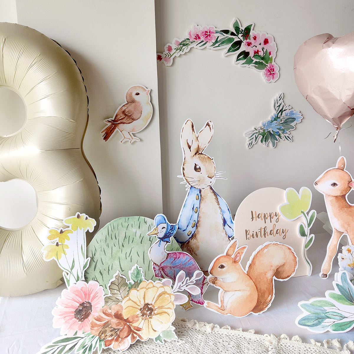 - 一套 14 幅手绘彼得兔和朋友们派对剪纸:以彼得兔、鹿、鸟、鸭妈妈和松鼠为特色,它们生活在一个鲜花盛开的花园中。非常适合营造异想天开的童话派对场景,非常适合桌面、地板和墙壁装饰。