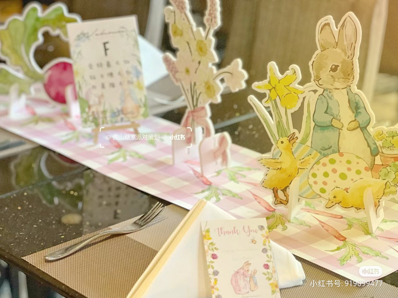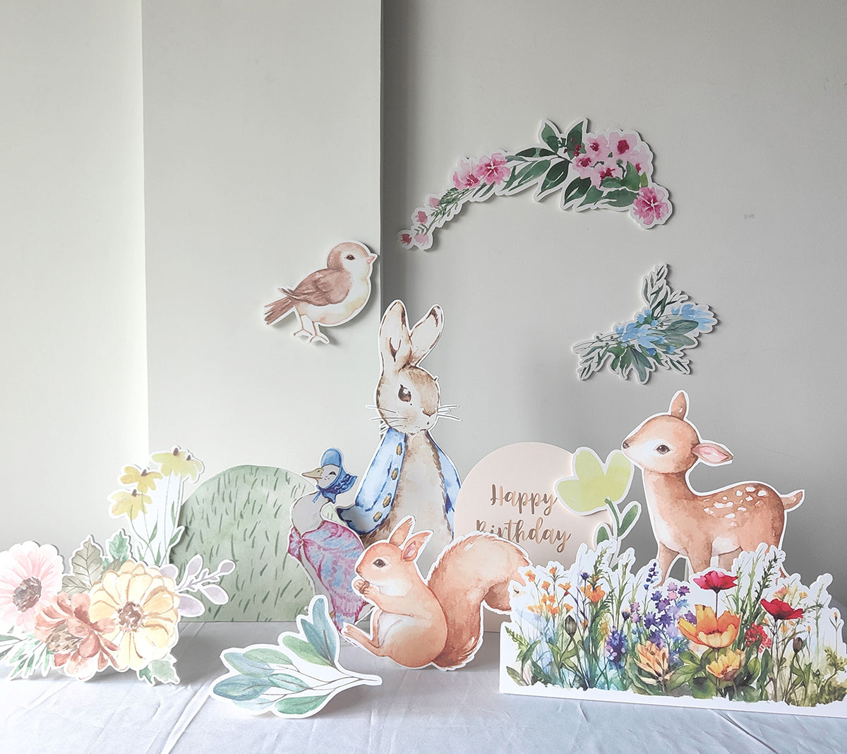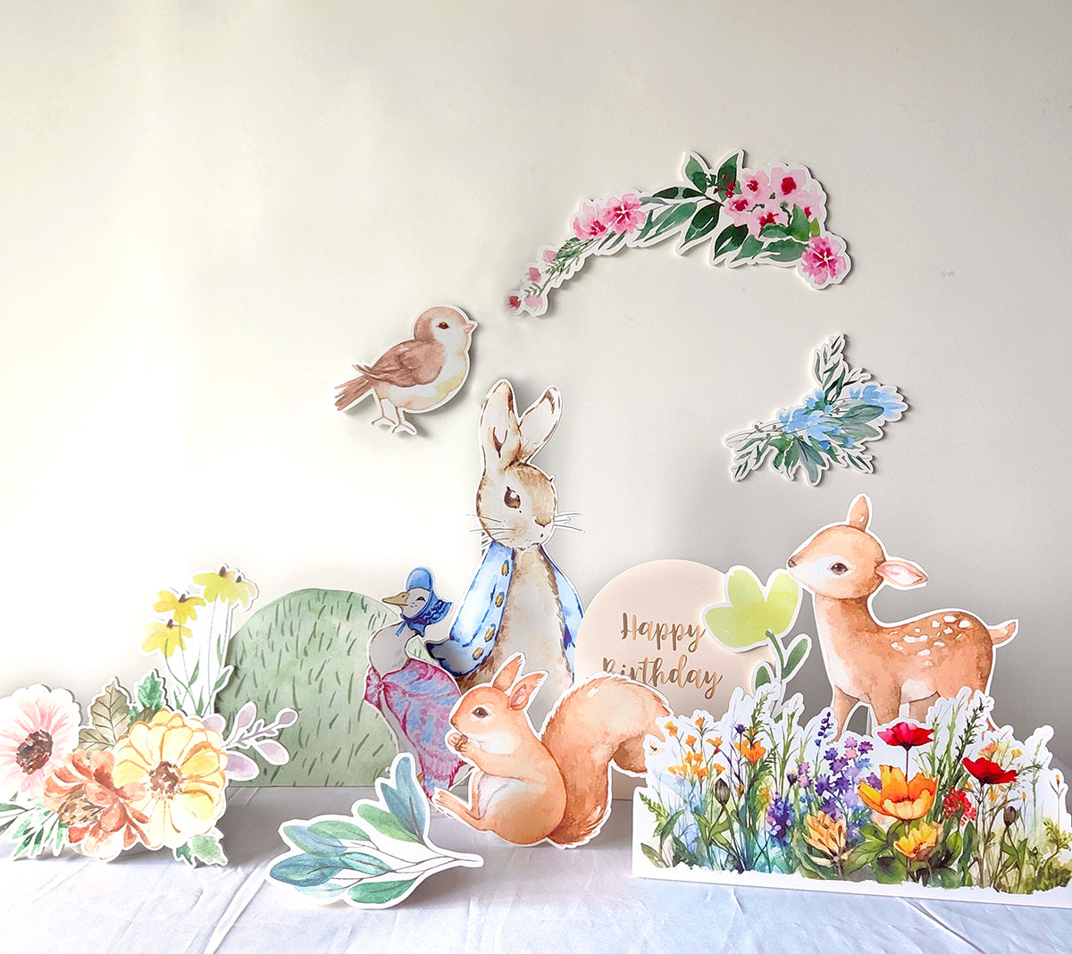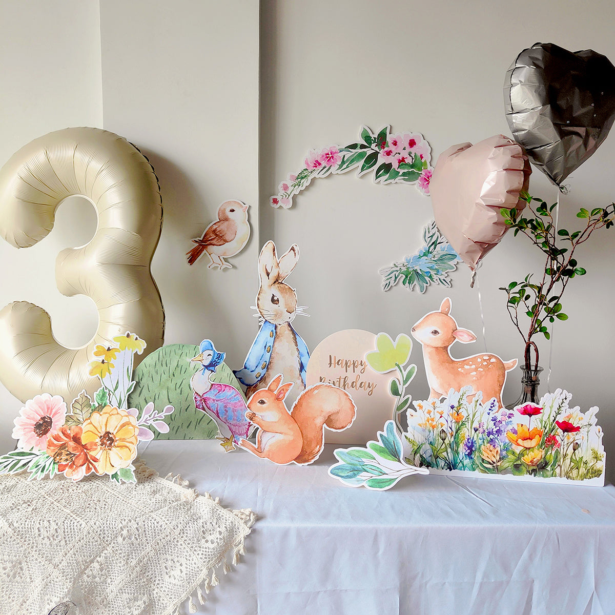 - 一套 14 幅手绘彼得兔和朋友们派对剪纸:以彼得兔、鹿、鸟、鸭妈妈和松鼠为特色,它们生活在一个鲜花盛开的花园中。非常适合营造异想天开的童话派对场景,非常适合桌面、地板和墙壁装饰。