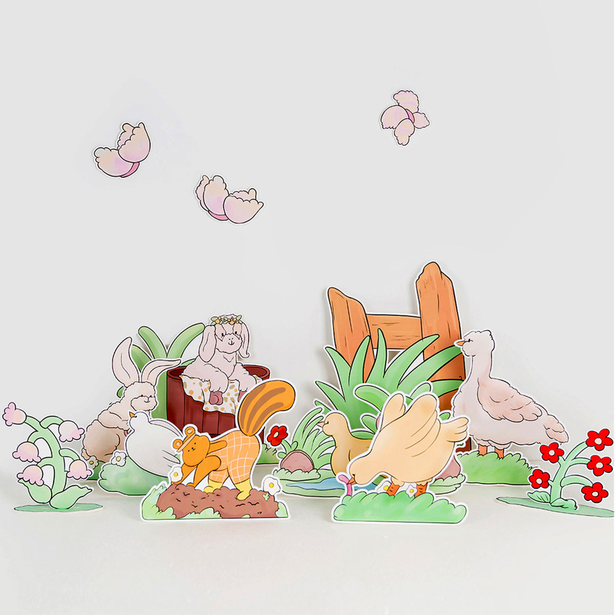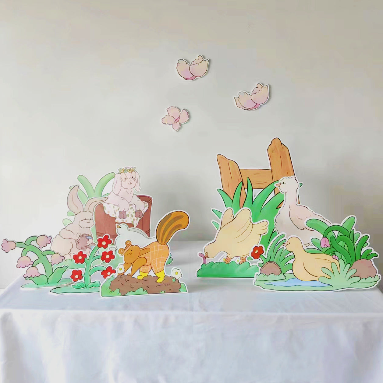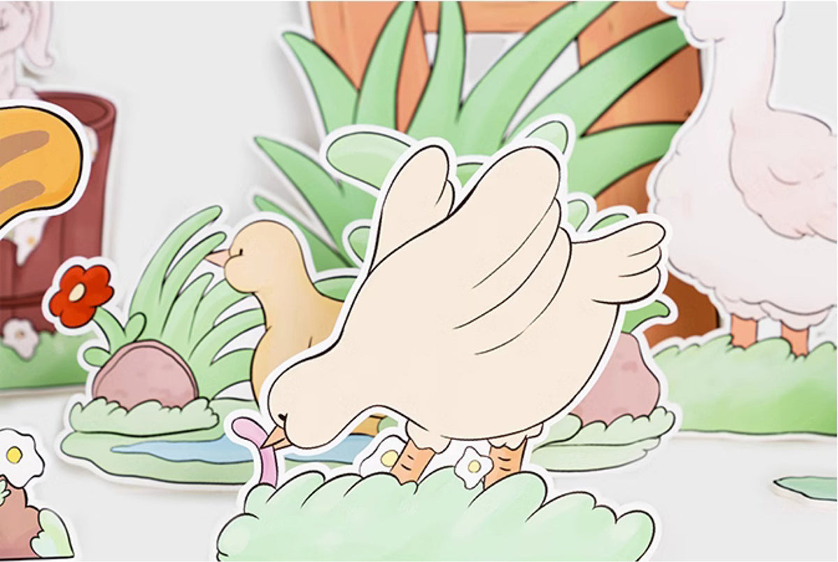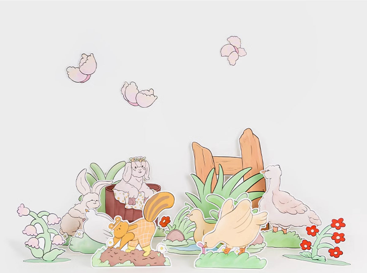- Set of 12 Hand-Painted Happy Farm Animal Party Cutouts: Featuring a lamb with a flower crown, butterflies, a rabbit watering flowers, a swimming duck, a chick eating insects, a dove resting on the grass, a walking goose, a digging groundhog, and lush flowers and leaves. Perfect for creating a joyful farm-themed party scene, ideal for tabletop, floor, and wall decorations.