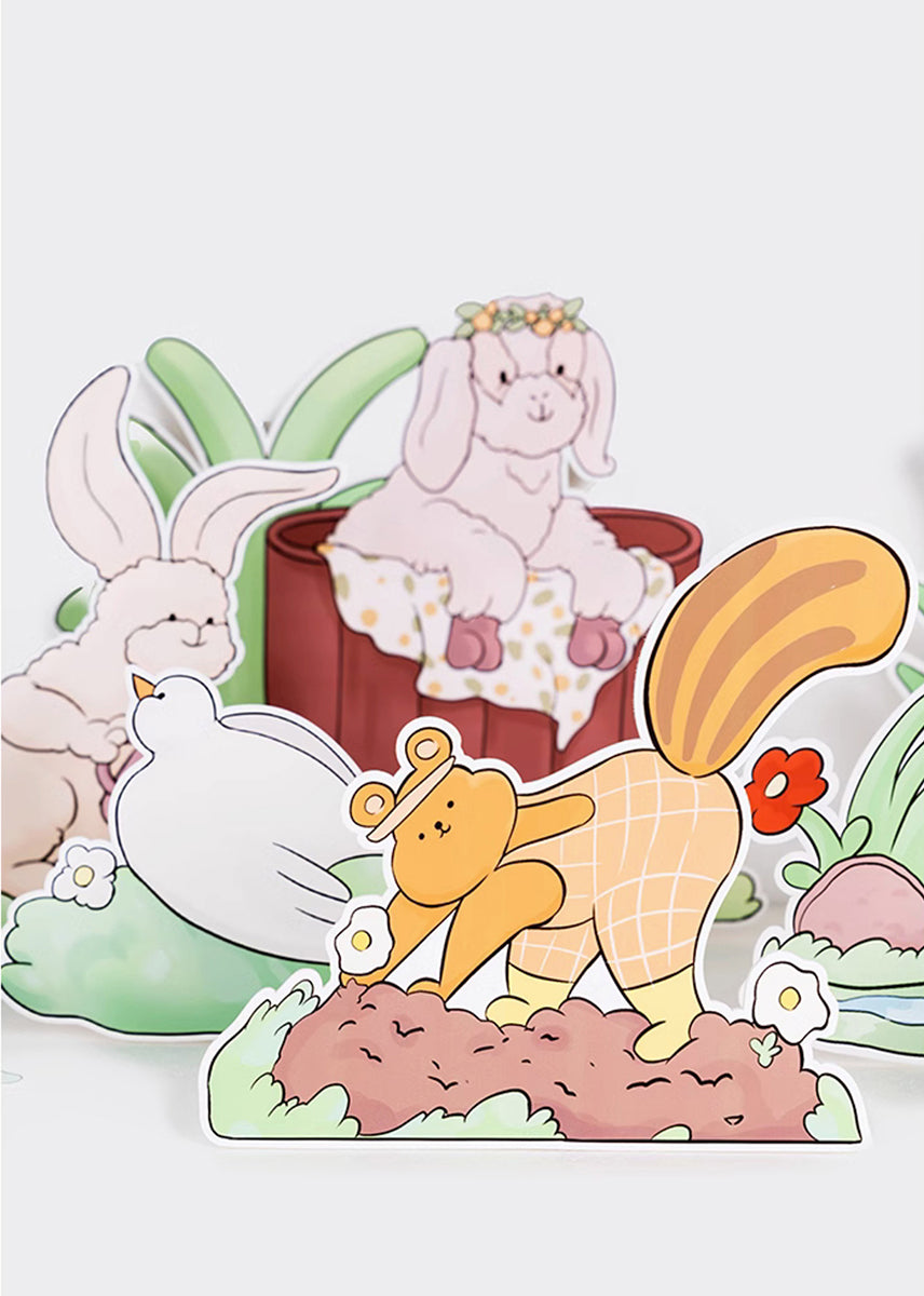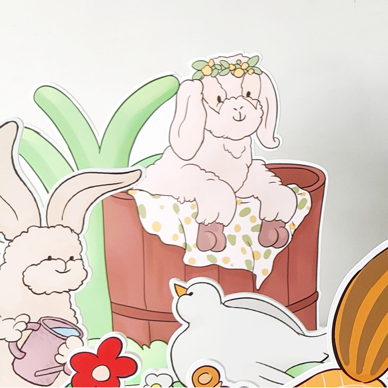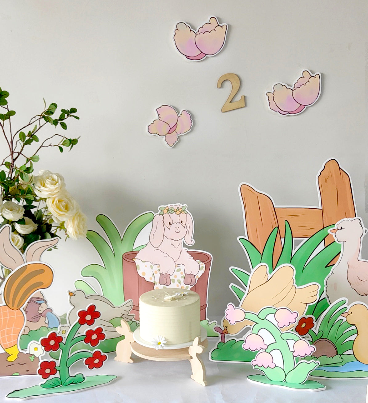 - Set of 12 Hand-Painted Happy Farm Animal Party Cutouts: Featuring a lamb with a flower crown, butterflies, a rabbit watering flowers, a swimming duck, a chick eating insects, a dove resting on the grass, a walking goose, a digging groundhog, and lush flowers and leaves. Perfect for creating a joyful farm-themed party scene, ideal for tabletop, floor, and wall decorations.