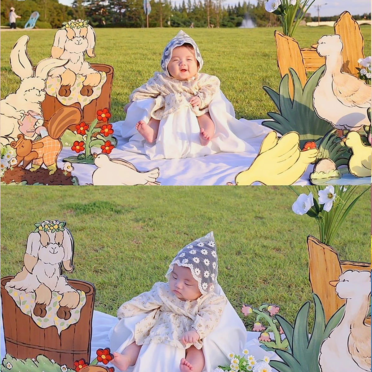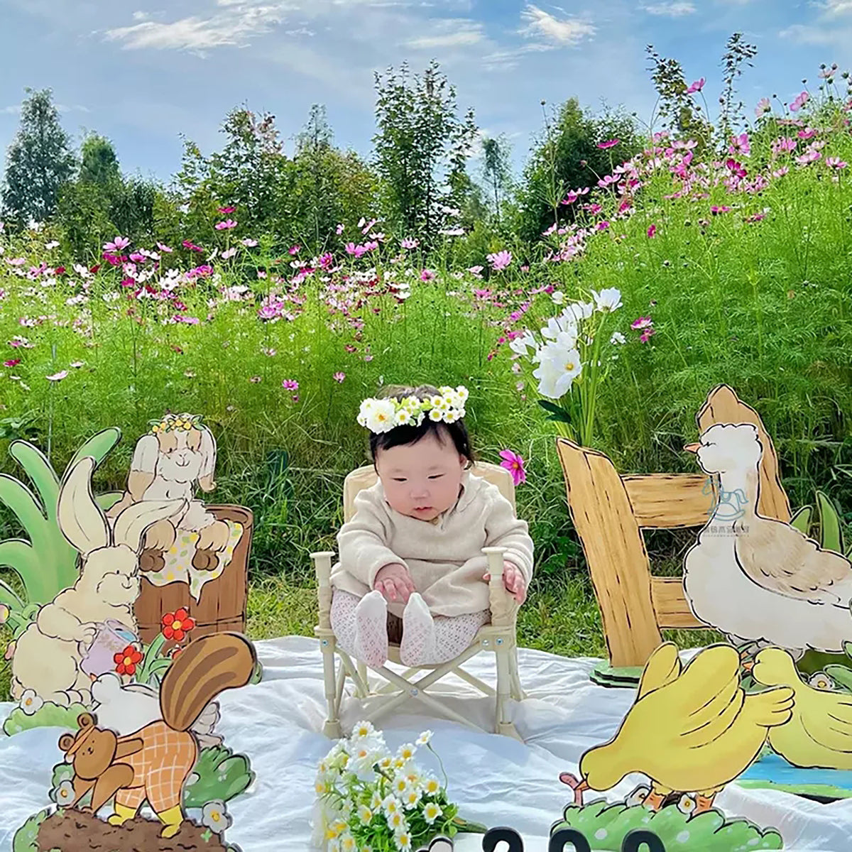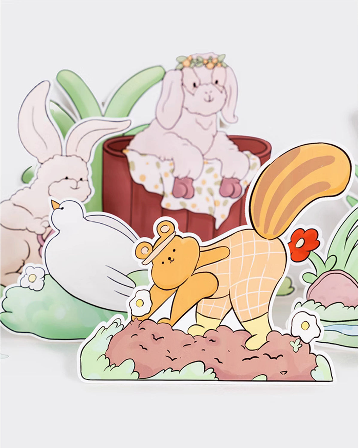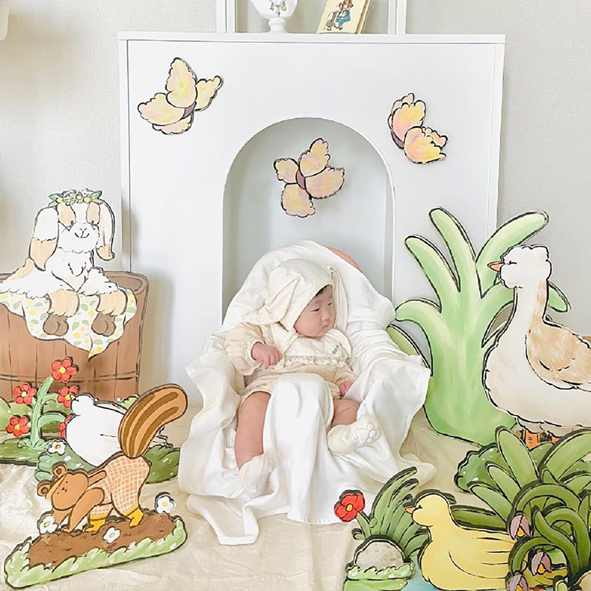 - Set of 12 Hand-Painted Happy Farm Animal Party Cutouts: Featuring a lamb with a flower crown, butterflies, a rabbit watering flowers, a swimming duck, a chick eating insects, a dove resting on the grass, a walking goose, a digging groundhog, and lush flowers and leaves. Perfect for creating a joyful farm-themed party scene, ideal for tabletop, floor, and wall decorations.