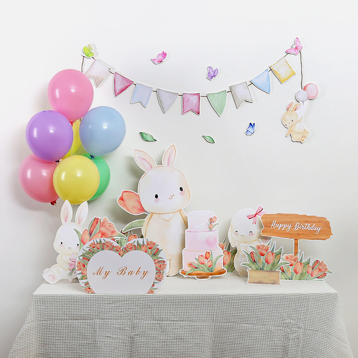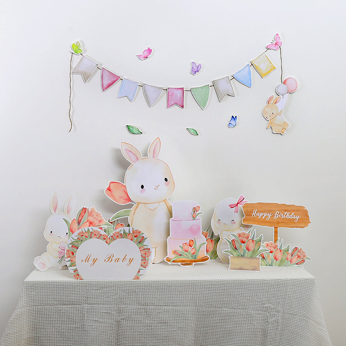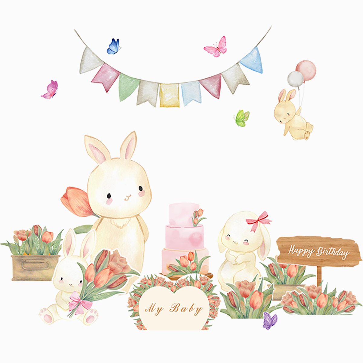 - The kit includes 24 watercolor hand-painted, high-definition printed foam cutouts: a bunny with a bow, a bunny holding tulips, a bunny with a bouquet, fluttering butterflies, a pink cake, a fairy tale-style tulip garden, a "Happy Birthday" sign, balloons, and a watercolor flag banner. The entire set is suitable for placement on tables, floors, and garden lawns, with standing flowers and bunnies perfect for wall decoration. The dimensions of the entire party decoration set are approximately 6ft/1.8M in height and 4.6ft/1.4M in width, creating a perfect fairy tale-style party scene. This kit is ideal for crafting a magical and whimsical birthday party atmosphere.
