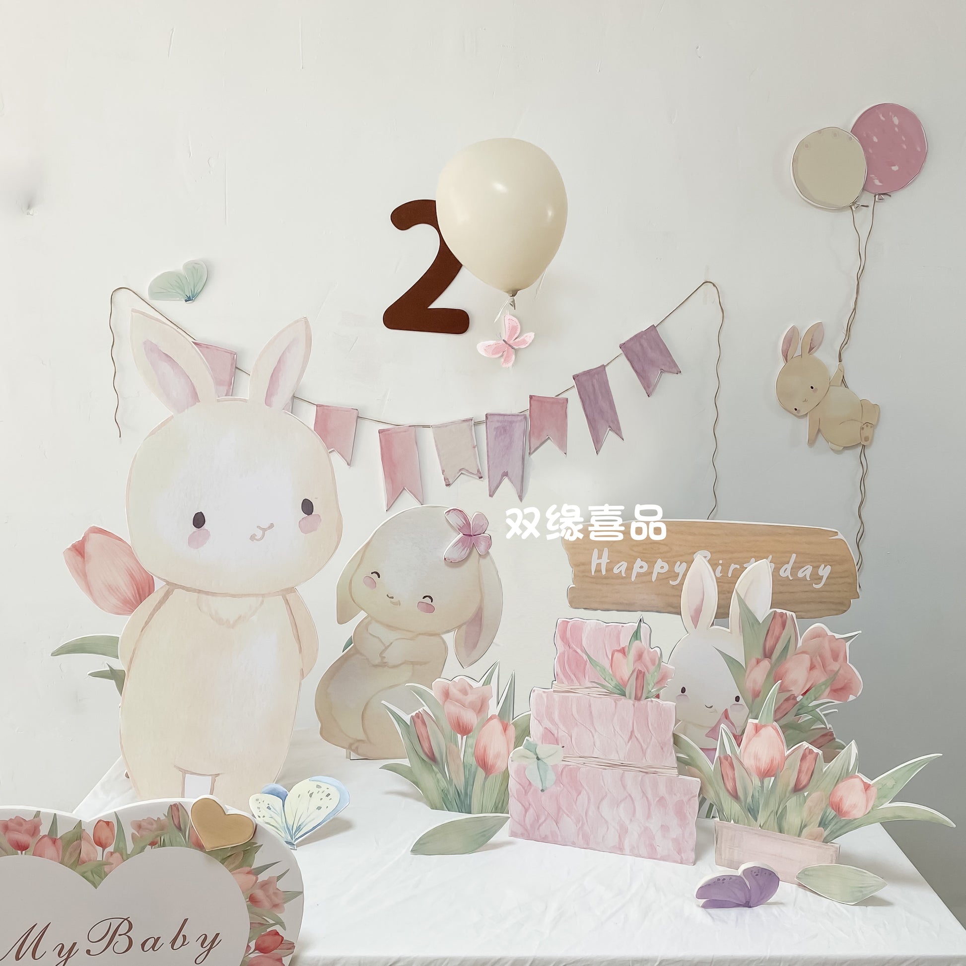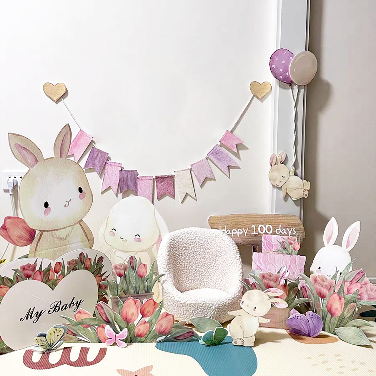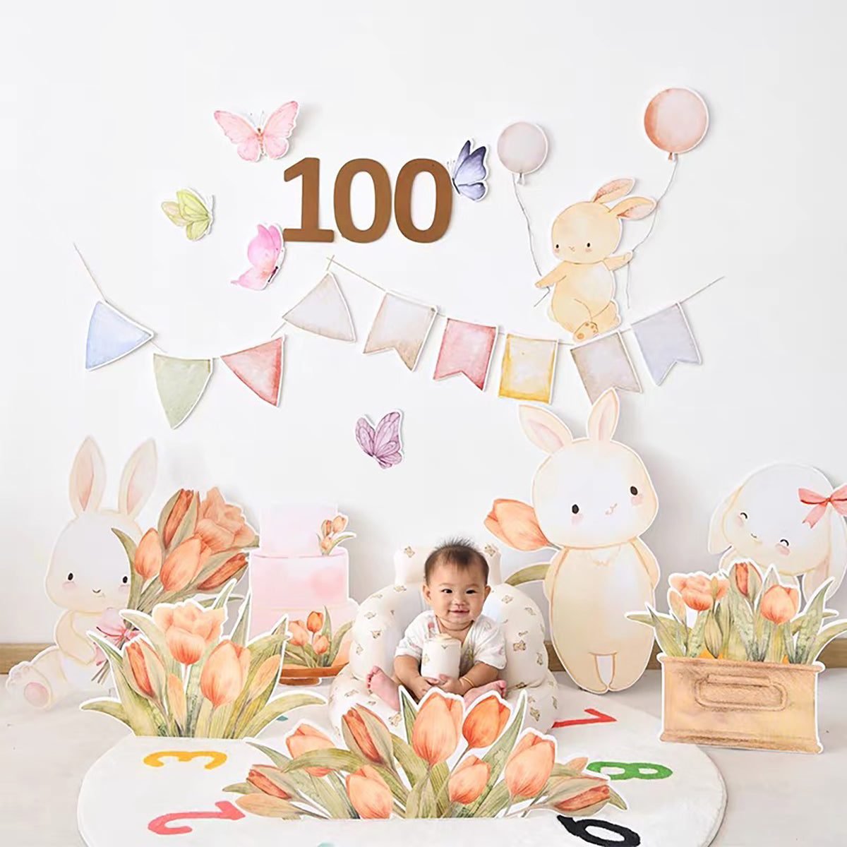 - The kit includes 24 watercolor hand-painted, high-definition printed foam cutouts: a bunny with a bow, a bunny holding tulips, a bunny with a bouquet, fluttering butterflies, a pink cake, a fairy tale-style tulip garden, a "Happy Birthday" sign, balloons, and a watercolor flag banner. The entire set is suitable for placement on tables, floors, and garden lawns, with standing flowers and bunnies perfect for wall decoration. The dimensions of the entire party decoration set are approximately 6ft/1.8M in height and 4.6ft/1.4M in width, creating a perfect fairy tale-style party scene. This kit is ideal for crafting a magical and whimsical birthday party atmosphere.